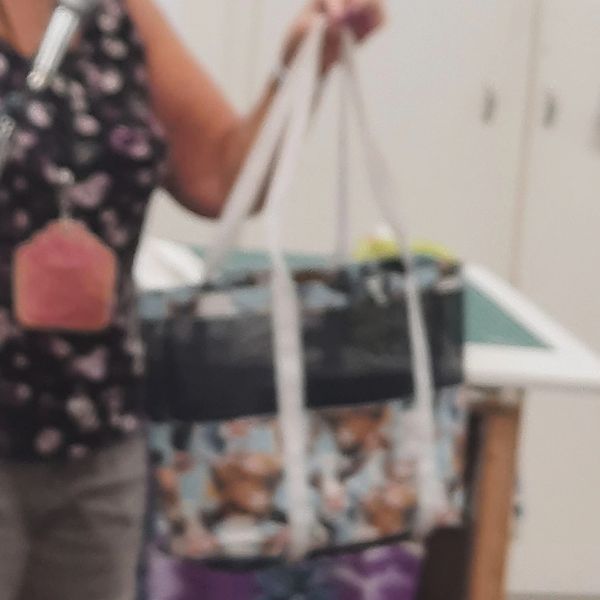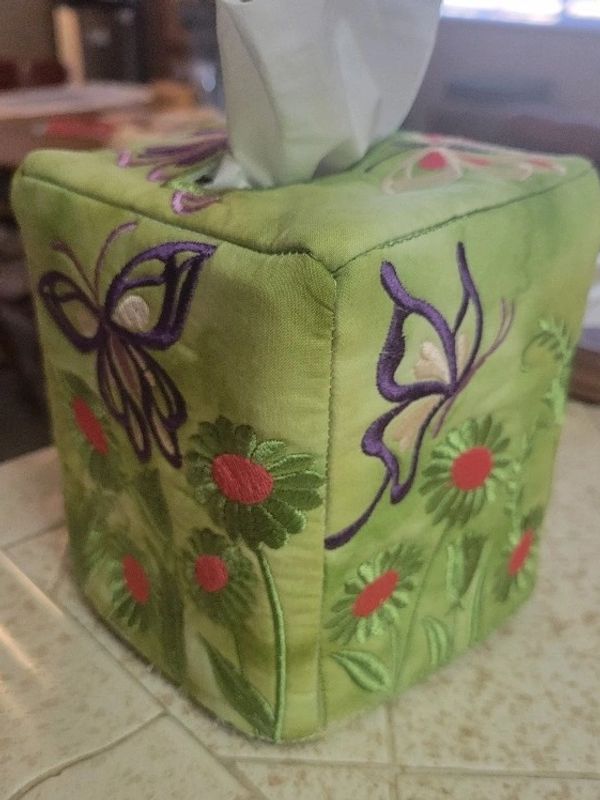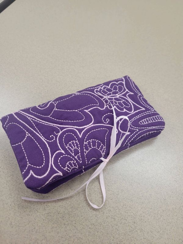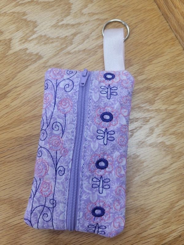 You will learn how to do folded fabric techniques. This is a fully lined bag with a zipper. It is done fully in the hoop. Completed bag is 6 inches by 4 inches and intended to be put on a key ring or snap.